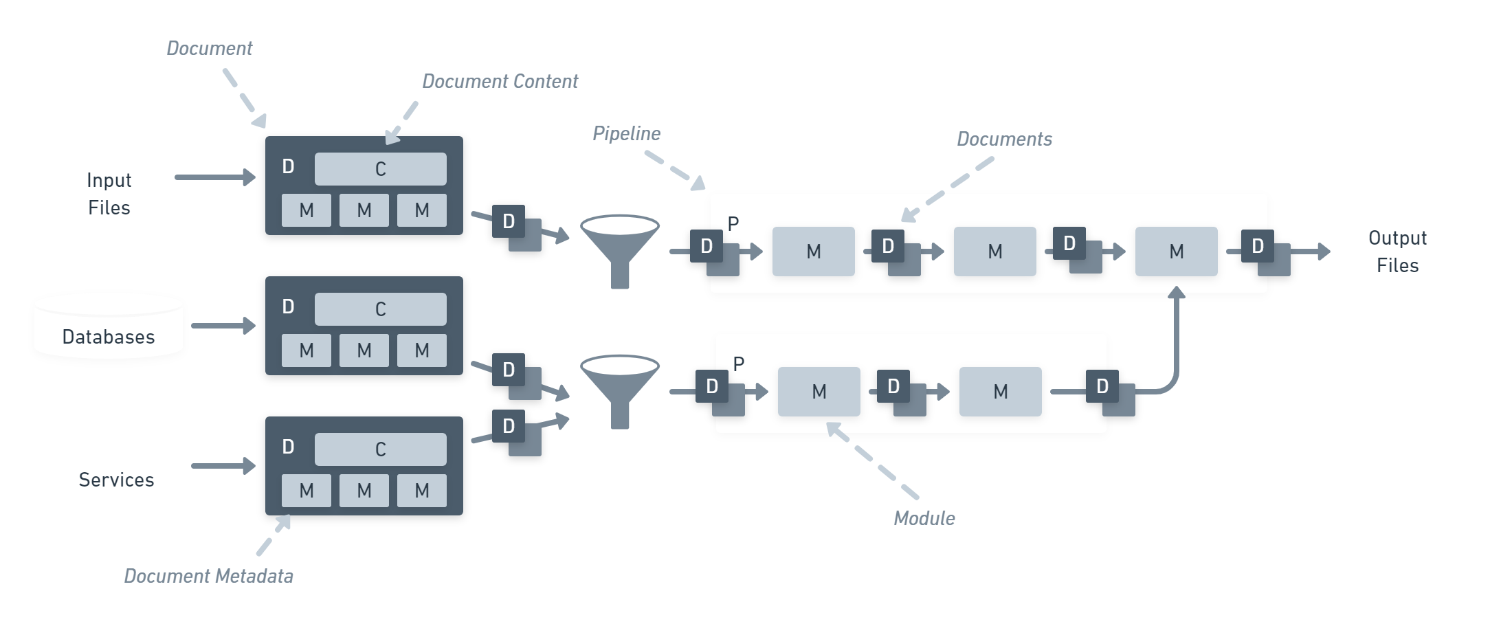- Each pipeline consists of one or more modules that manipulate the documents given to it by transforming, aggregating, filtering, or producing entirely new documents.